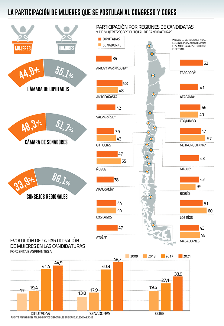 Análisis del PNUD exhibe que las aspirantes a senadoras son 48,3% del total, mientras que a diputadas están en 44,9%,lo que significó un aumento de 7,4 y 3,5 puntos porcentuales en comparación con 2017.