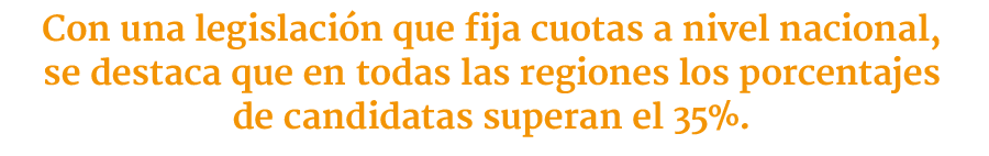 Con una legislación que fija cuotas a nivel nacional, en el análisis por regiones Guerrero destaca que a pesar de que se ven “algunas diferencias” entre ellas, en todas los porcentajes de candidatas superan el 35% y “hay varias que se acercan a la paridad”.