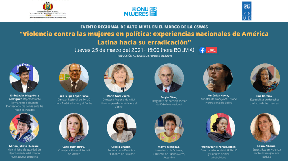 Convocado por el Estado Plurinacional de Bolivia en colaboración con PNUD y ONU Mujeres, en el marco del sexagésimo quinto período de sesiones de la Comisión de la Condición Jurídica y Social de la Mujer (CSW65), este evento paralelo abordó los principales desafíos y responsabilidades institucionales para un abordaje integral de la violencia contra mujeres en política. También se lanzó la publicación de ATENEA , una sistematización de las diversas estrategias implementadas en la región para erradicar este tipo de violencia basada en género e impulsar acciones nacionales y regionales para garantizar una vida pública y política libre de violencia para las mujeres. Asimismo, se presentaron y profundizaron las experiencias de Bolivia, México, Ecuador y Argentina en materia de prevención, monitoreo y sanción de casos de acoso y violencia política basada en género.